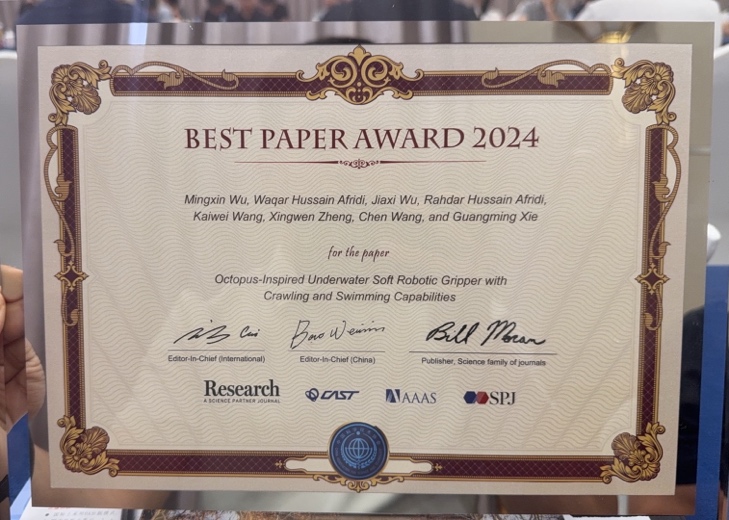 近日,北京大学谢广明教授团队论文“Octopus-Inspired Underwater Soft Robotic Gripper with Crawling and Swimming Capabilities”荣获期刊Research的2024年度BEST PAPER AWARD(最佳论文奖)。