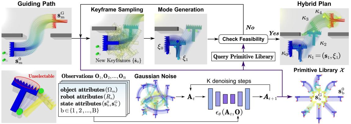 针对上述挑战,课题组将整体问题建模为组合-混合优化(Combinatorial Hybrid Optimization, CHO):在高层需要动态决定“机器人子群与物体”的分配与协同次序,在底层需要为每个物体生成由推运模式与推力参数组成的混合执行序列。具体而言,方法首先基于多智能体路径规划(MAPF)对多物体推运任务进行分解,并构建带严格部分序关系的推运子任务;随后采用滚动时域协调策略,依据可行性与时长估计在线分配机器人子群;再通过关键帧引导的混合搜索,为每个子任务迭代生成可行且代价更优的推运模式序列,并配套在线混合控制与自适应机制以应对滑移、漂移等非理想因素。为进一步提升规划效率,团队引入扩散模型神经加速器,用于预测应优先探索的关键帧与推运模式,从而显著降低混合搜索开销;同时在温和假设下给出完备性与性能保证。